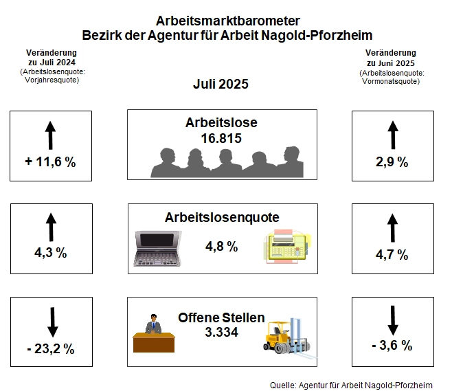 Unter den sieben Geschäftsstellen der Agentur für Arbeit Nagold-Pforzheim hat Nagold mit 3,8 Prozent den besten Wert. Es folgen Calw mit 4,0 Prozent, Mühlacker mit 4,1 Prozent, Freudenstadt mit 4,4 Prozent, Horb mit 4,5 Prozent, Pforzheim mit 5,5 Prozent sowie Bad Wildbad mit 5,9 Prozent.