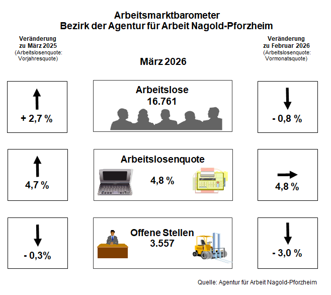 Die Zahl der Arbeitslosen im Bezirk der Agentur für Arbeit Nagold-Pforzheim ist von Februar auf März um 143 oder 0,8 Prozent auf 16.761 zurückgegangen. Im Vergleich zum Vorjahr ist die Arbeitslosigkeit im Nordschwarzwald dagegen um 442 oder 2,7 Prozent gestiegen.