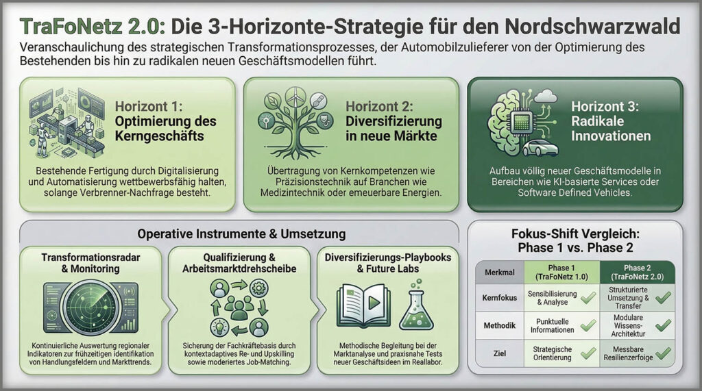Derweil sei die Fortführung des Projekts nach der beantragten Förderperiode bereits gesichert, gibt Landrat Helmut Riegger als Vorsitzender des WFG-Aufsichtsrats bekannt: Der Aufsichtsrat der WFG habe in einem Grundsatzbeschluss die dauerhafte Verankerung des Transformationsnetzwerks von 2030 an bestätigt. Das Netzwerk solle nach dem Ende der Förderperiode auf eigenen Beinen stehen und fortgeführt werden. Das Konzept hinter TraFoNetz 2.0 folge einem sogenannten 3-Horizonte-Ansatz, erläutert Professor Dr. Bernhard Kölmel von der Hochschule Pforzheim. Im ersten Horizont gehe es darum, das laufende Kerngeschäft durch Digitalisierung und Automatisierung wettbewerbsfähig zu halten. Im zweiten Horizont würden Unternehmen dabei unterstützt, ihre Kernkompetenzen, etwa in der Präzisionsbearbeitung oder im Sondermaschinenbau, auf neue Branchen wie Medizintechnik, Energietechnik oder die Sicherheitsindustrie zu übertragen. Der dritte Horizont ziele auf radikale Innovation: neue Geschäftsmodelle im Bereich software-definierter Fahrzeuge, KI-basierter Dienste oder datengetriebener Mobilität.