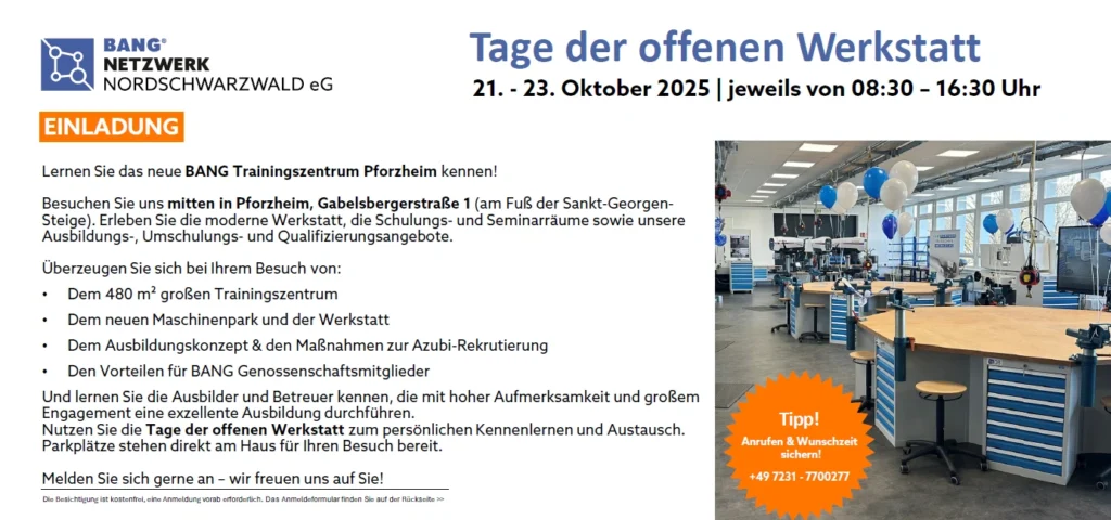 Im Rahmen der „Tage der offenen Werkstatt“ präsentiert das Ausbildungsnetzwerk BANG Nordschwarzwald eG sein umfassendes Angebot rund um Ausbildung, Weiterbildung, Umschulung und Azubi-Recruiting. Besucherinnen und Besucher erhalten Einblicke in: