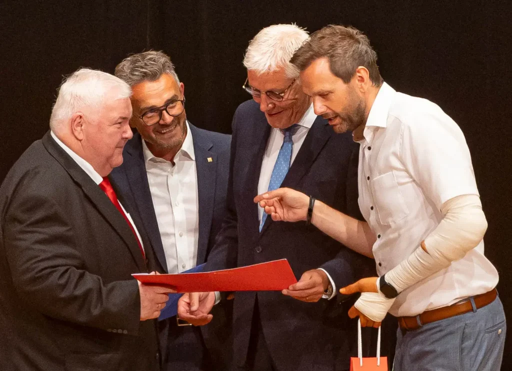 Die Spitze des Verwaltungsrats – Landrat Helmut Riegger als Vorsitzender, sein Kollege Bastian Rosenau und Pforzheims Oberbürgermeister Peter Boch – überreichte dem scheidenden Vorstandschef eine Dankesurkunde. Charmant durch den Abend führte die Journalistin und Betriebswirtin Camilla Biasio.