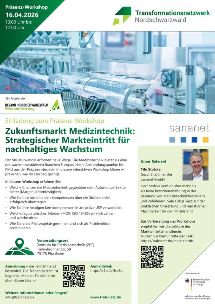 Für eine vertiefte operative Auseinandersetzung laden wir Sie herzlich zu unserem Präsenz-Workshop ein. Gemeinsam mit Branchenexperte Tilo Stolzke (sananet GmbH), der über 40 Jahre Erfahrung in der MedTech-Beratung verfügt, erarbeiten wir realistische Szenarien für Ihren Markteintritt und beantworten Ihre Anliegen in der Anwendung des Handbuchs.
